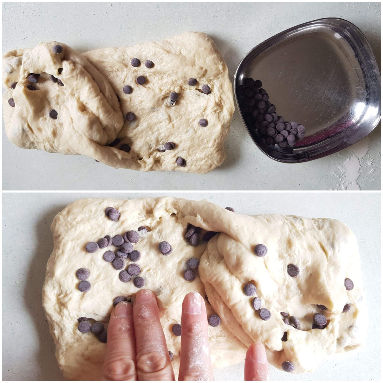 Nimm den Teig aus der Schüssel, leg auf eine bemehlte Arbeitsfläche und knete noch die Schokodrops hinein.