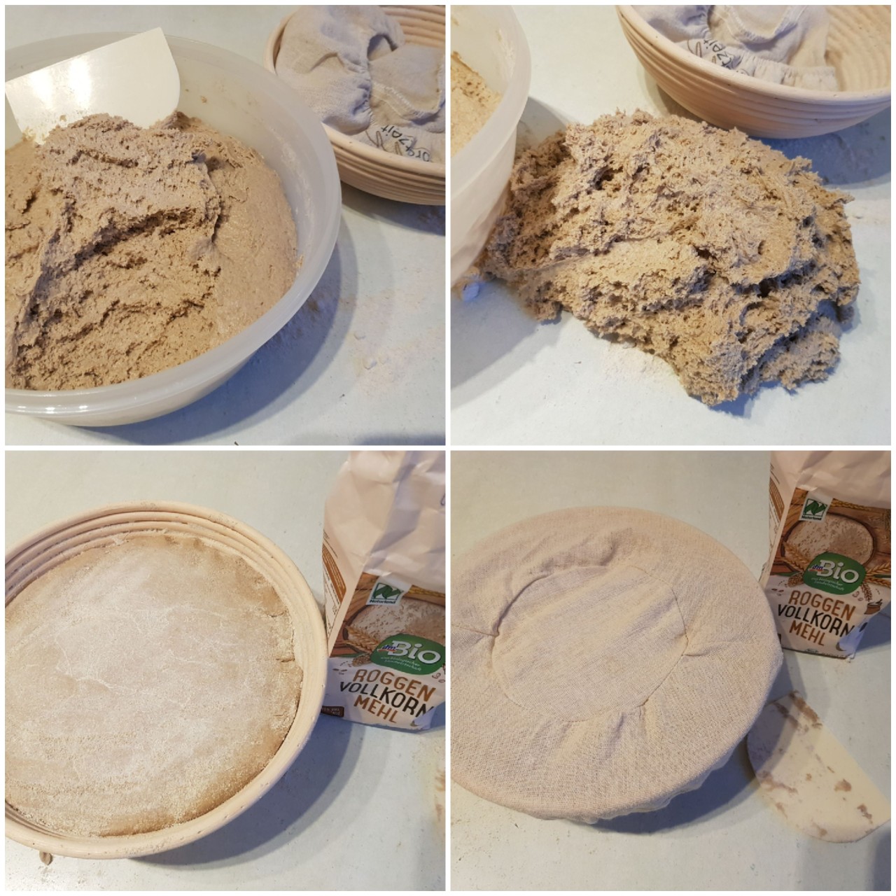 Jetzt gibst Du den Teig auf eine mit Roggenmehl bestreute Arbeitsfläche, knetest es kurz mit etwas Mehl durch und formst es zu einer Kugel. Diese bemehlen und noch einmal für etwa 1 Stunde in ein mit Roggenmehl bemehltes Gärkörbchen oder in ein mit einem Tuch ausgelegtes Sieb legen und zudecken.