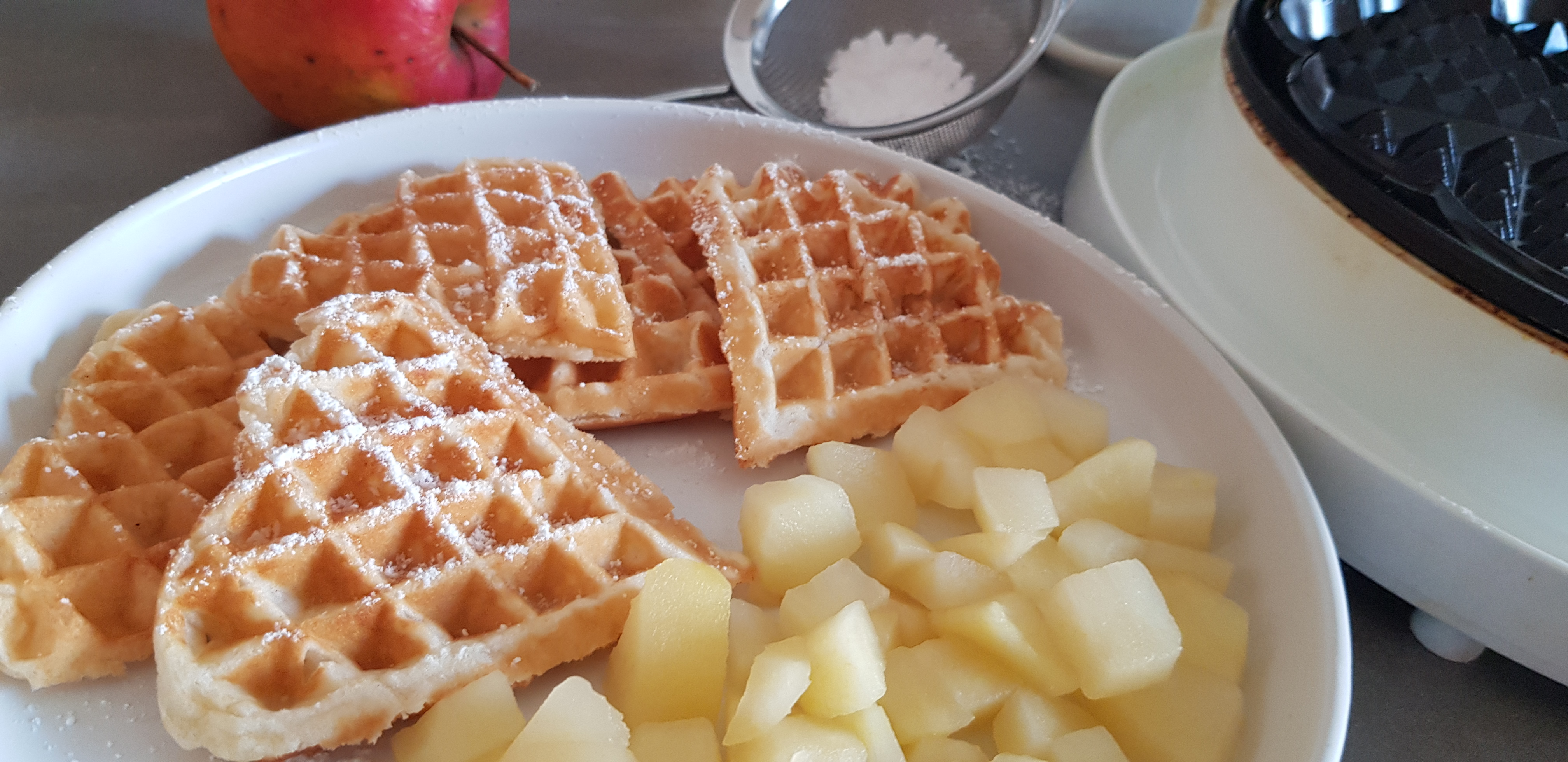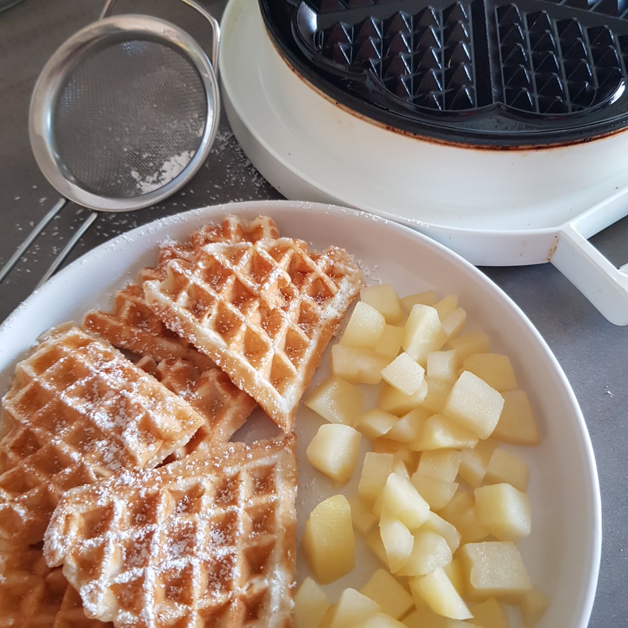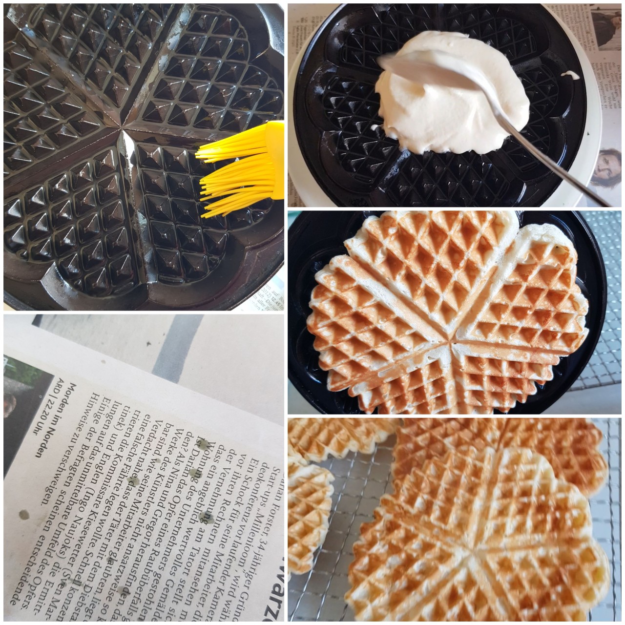 Waffeleisen vorheizen und einfetten. Etwa 2 gehäufte EL Teig hineingeben und auf Stufe 4 ausbacken.