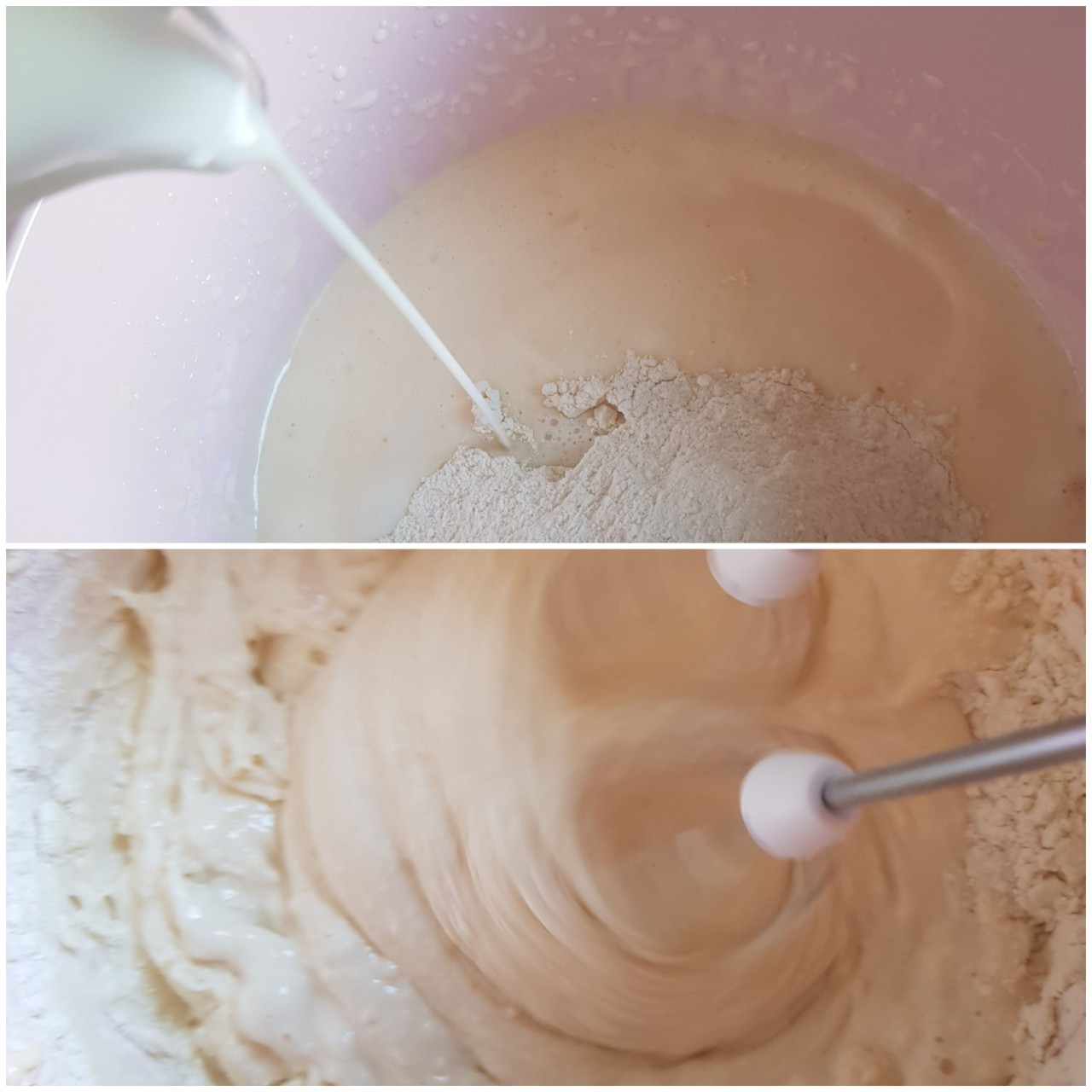 Mehl mit Backpulver mischen und abwechselnd mit der Milch und zu einem glatten, leicht zähen Teig rühren.