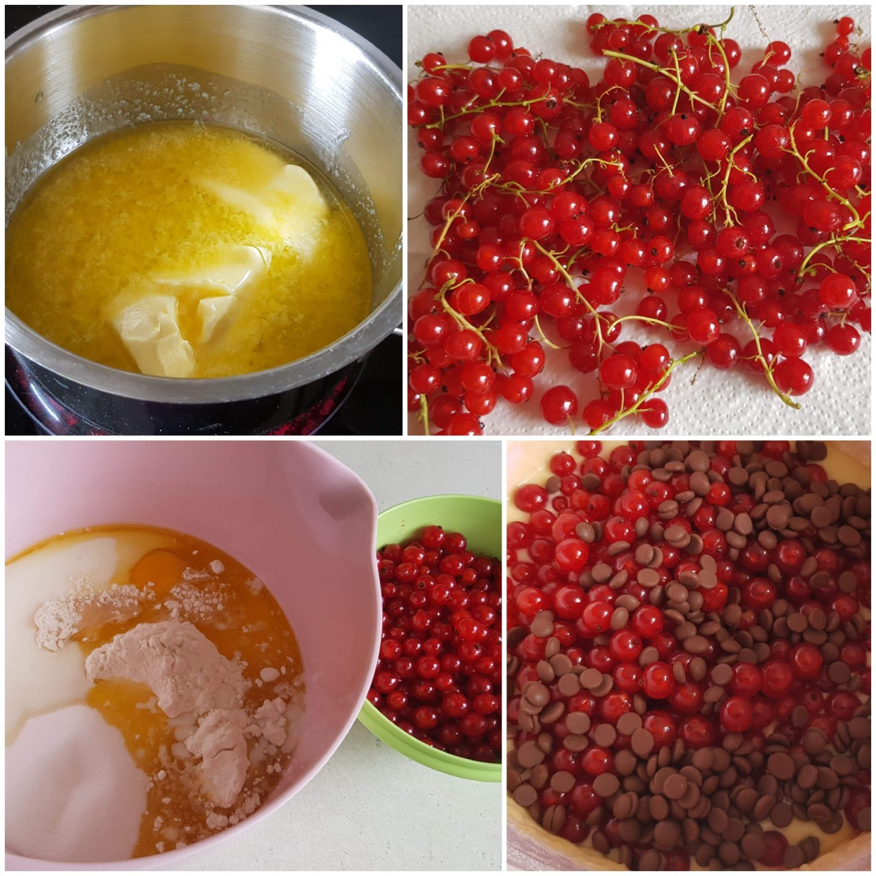 Alles zu einem Teig verrühren. Die Johannisbeeren zusammen mit den Schokodrops unter den Teig rühren.