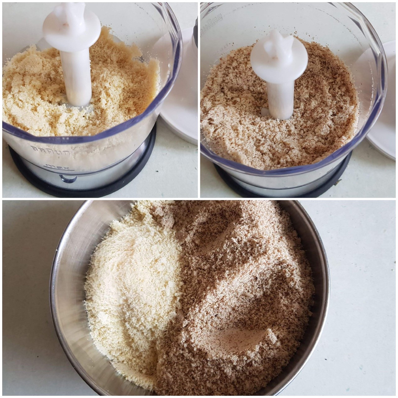 Die Mandeln feinmahlen. Den Ofen auf 170 Grad O/U Hitze vorheizen.