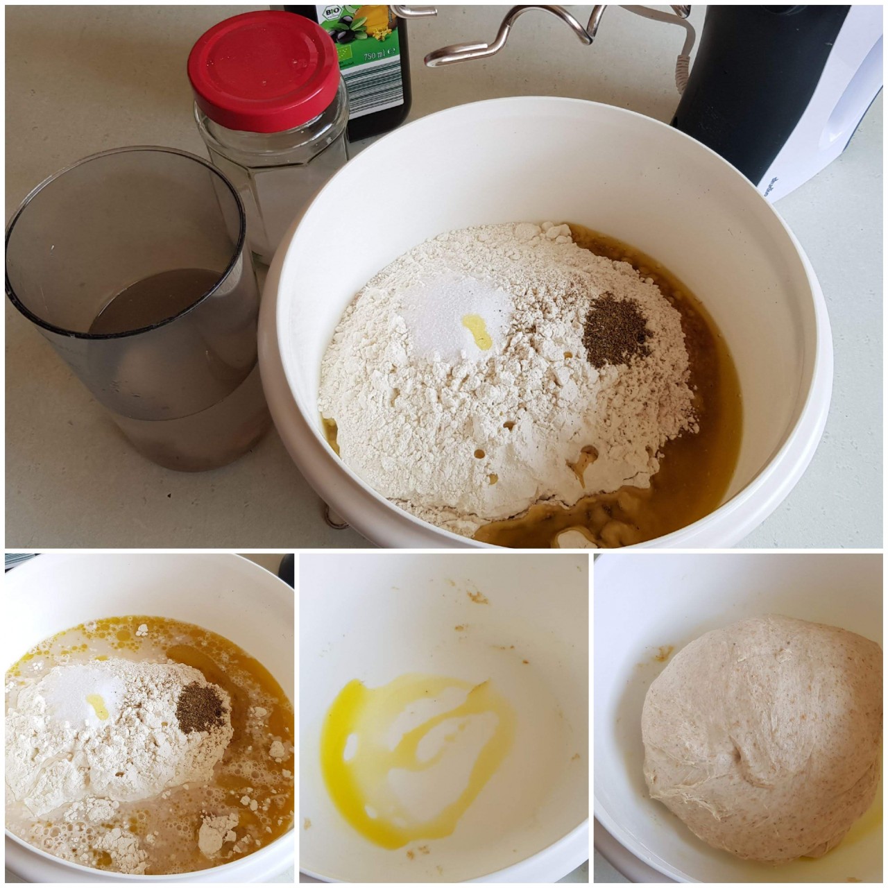 Mehl und Salz in eine Schüssel geben, die Hefe hineinbröseln das lauwarme Wasser zusammen mit dem Olivenöl zu dem Mehl geben. Alles zu einem glatten Teig verkneten. Die Schüssel leicht ölen oder mit Mehl austäuben, den Teig hineingeben und zugedeckt für mindestens 1 Stunde gehen lassen. Er sollte sich verdoppeln.