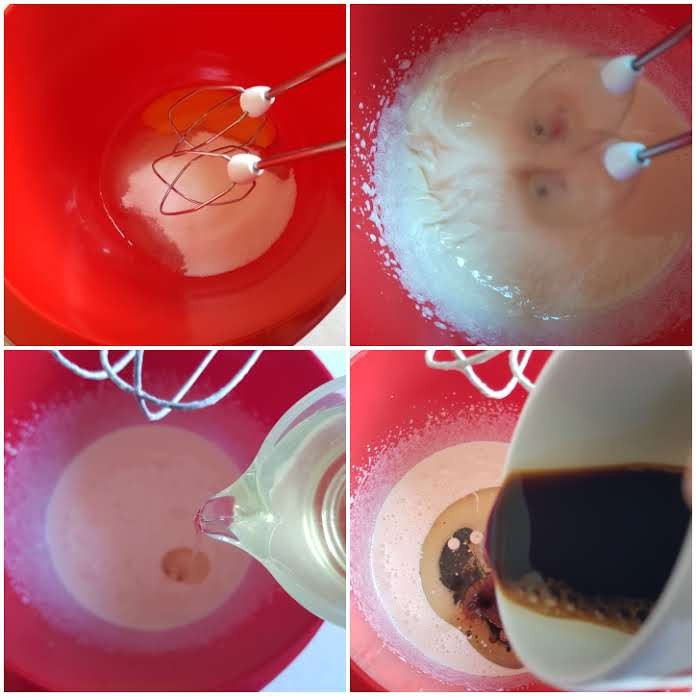 Schlage das Ei mit dem Zucker cremig auf. Gib dann Joghurt und Öl dazu. Gieße den Kaffee hinzu und rühre alles kurz durch.