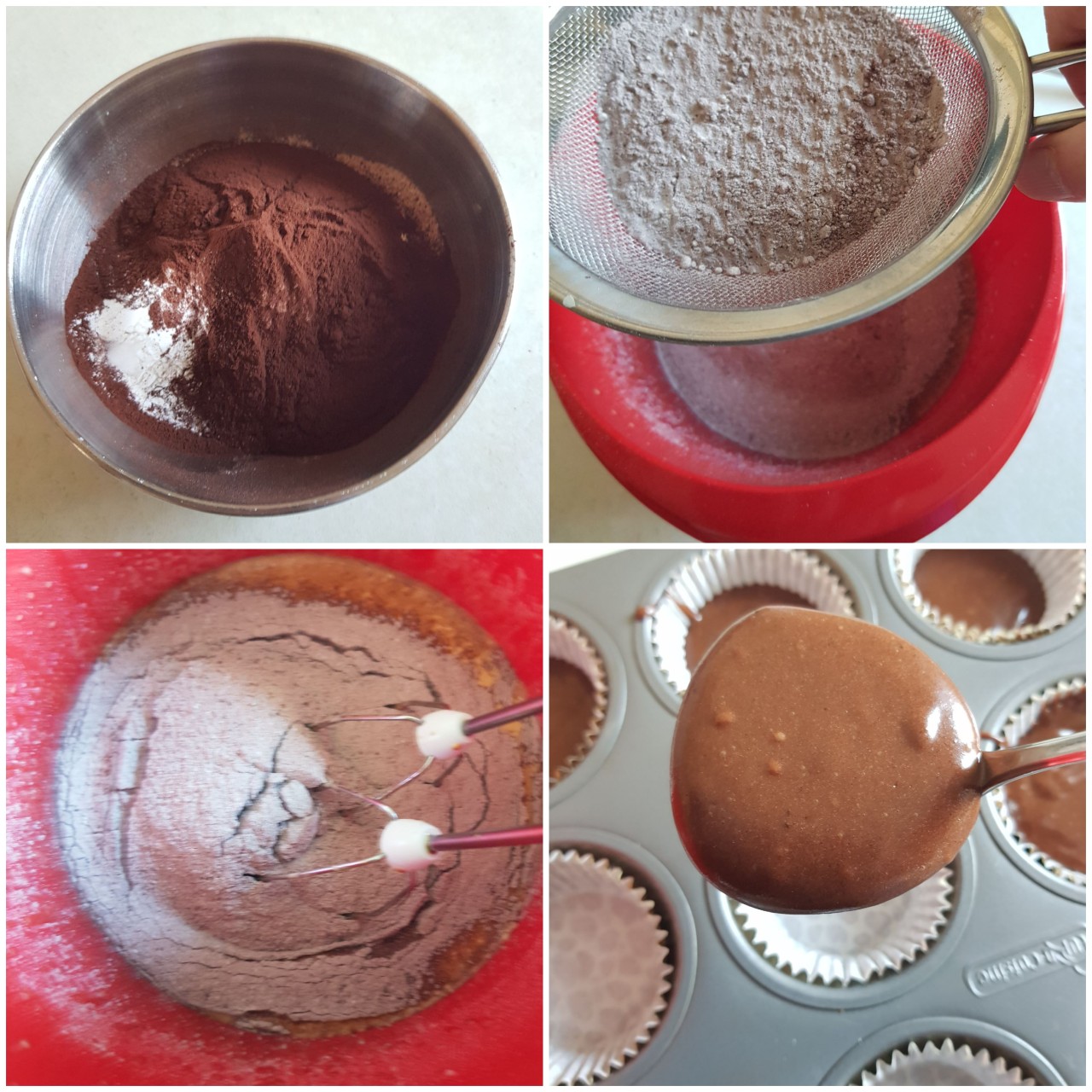 Mische Mehl, Backpulver, Natron und Kakao und siebe es über die Eiermasse.