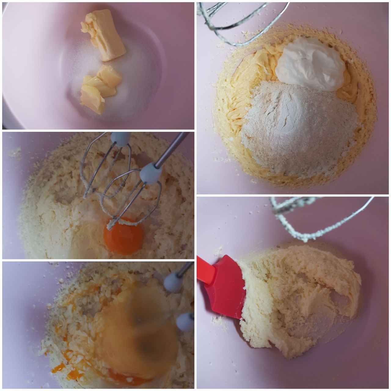 Rühre als erstes die weiche Butter mit Zucker, Vanillezucker und der Prise Salz sehr cremig auf. Gib dann die Eier einzeln hinzu und rühre jedes 1 Minute unter. Als nächstes mischst Du Mehl und Backpulver und gibst es abwechselnd mit der sauren Sahne zu der Eiermasse und rührst es unter.