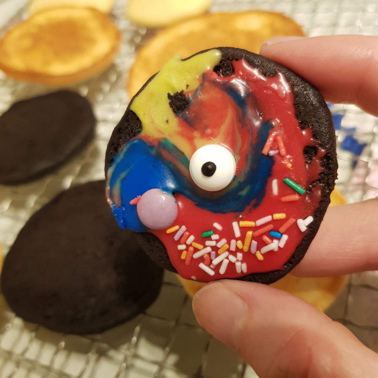 Verrühre 200 g Puderzucker, gesiebt, mit etwa 30 ml Zitronensaft und bestreiche die Amerikaner damit. Du kannst den Guss für noch lustigere Amerikaner auch noch mit Lebensmittelfarben einfärben. Für die Deko habe ich verschiedene Süßwaren, wie Zuckeraugen, Gummischlangen, mini Smarties..., verwendet.