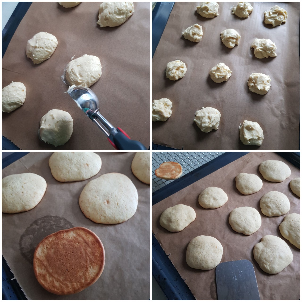 Nun setzt Du aus dem Teig mit zwei angefeuchteten Esslöffeln oder einem Eisportionierer jeweils 12 kleine Teighäufchen auf das erste Blech und streichst sie etwas glatt. Den restlichen Teig stellst Du für die Zeit in den Kühlschrank. Backe sie dann im heißen Backofen (Mitte) nacheinander für 10-12 Minuten. Danach lässt Du sie auf einem Kuchengitter abkühlen.