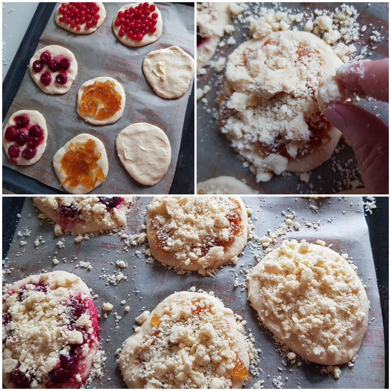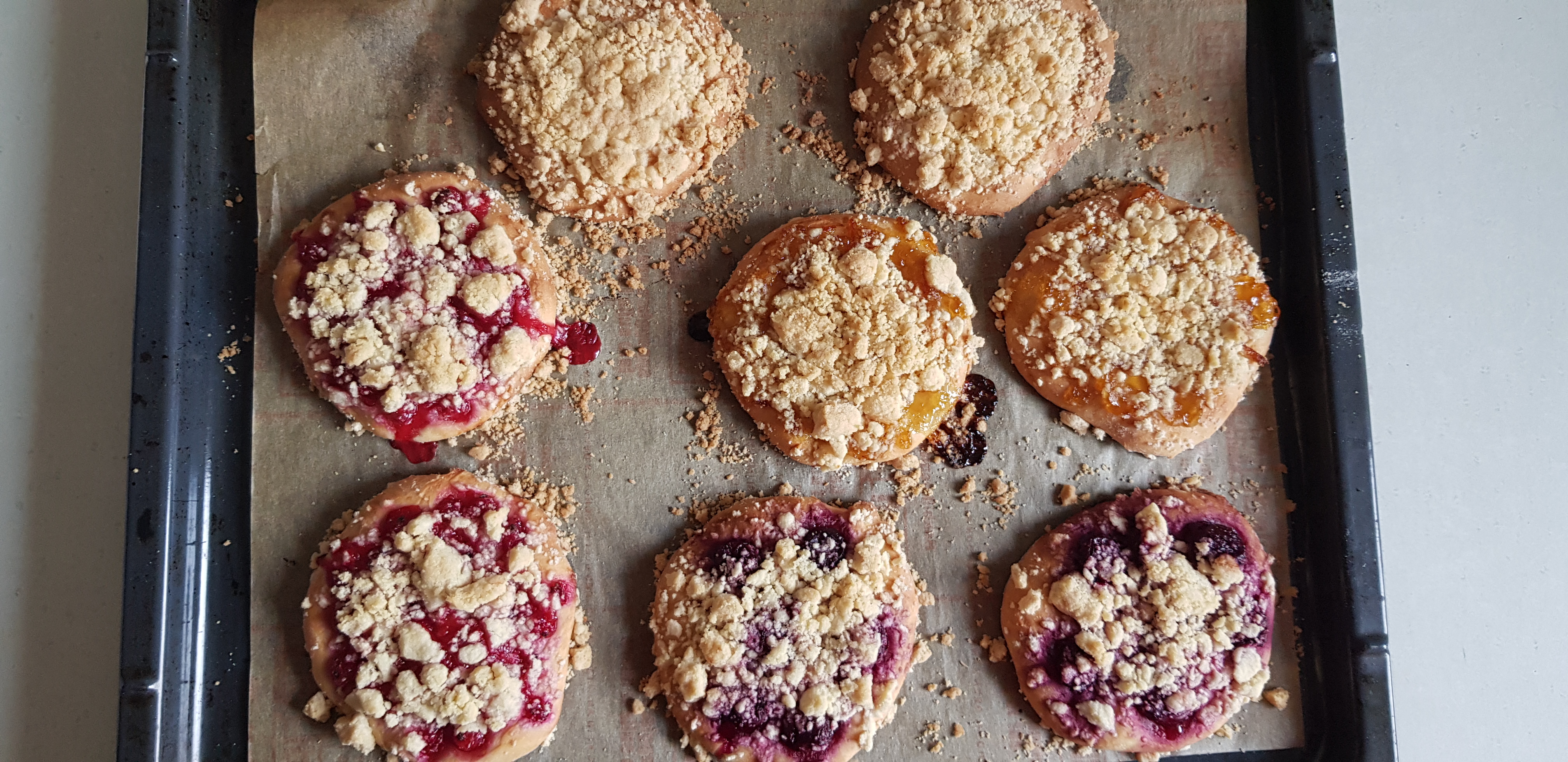Du kannst sie nun mit ein paar Früchten belegen oder einfach nur mit etwas weicher Butter oder Deiner Lieblingsmarmelade bestreichen und dann die Streusel darauf verteilen.