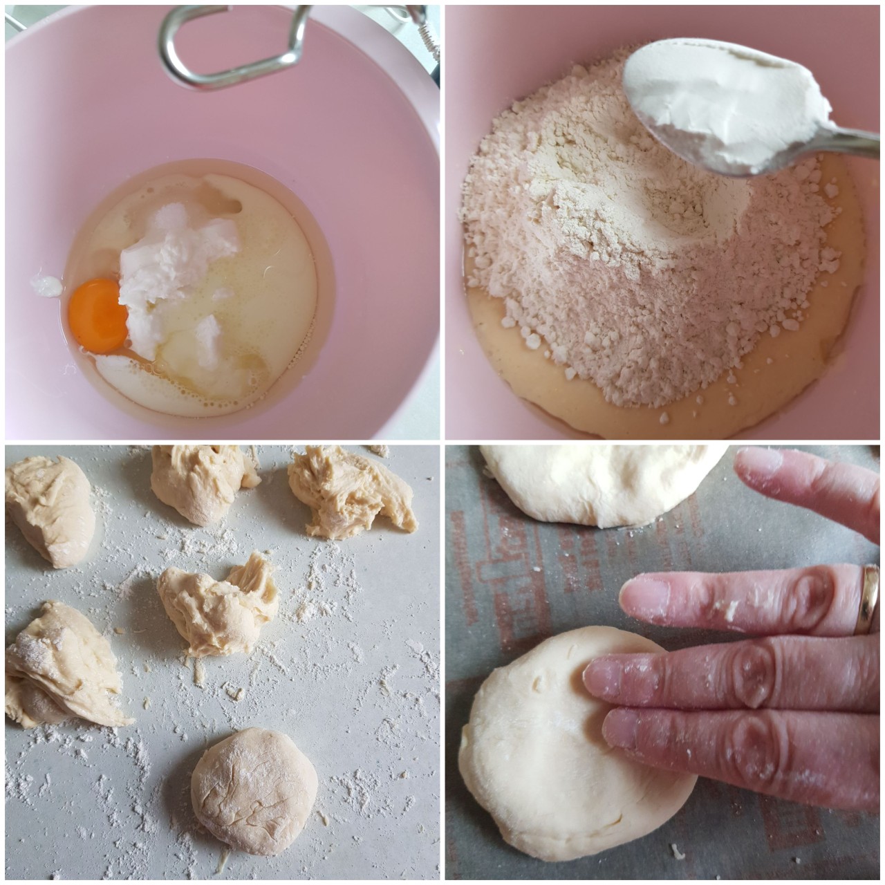 Teile den Teig in acht gleichmäßige Portionen, etwa 70g. Dabei bemehlst Du Deine Hände. Forme jede Portion zu einer Kugel, lege sie auf das vorbereitete Backblech und drücke sie etwas flach, so dass ein kleiner Rand entsteht.