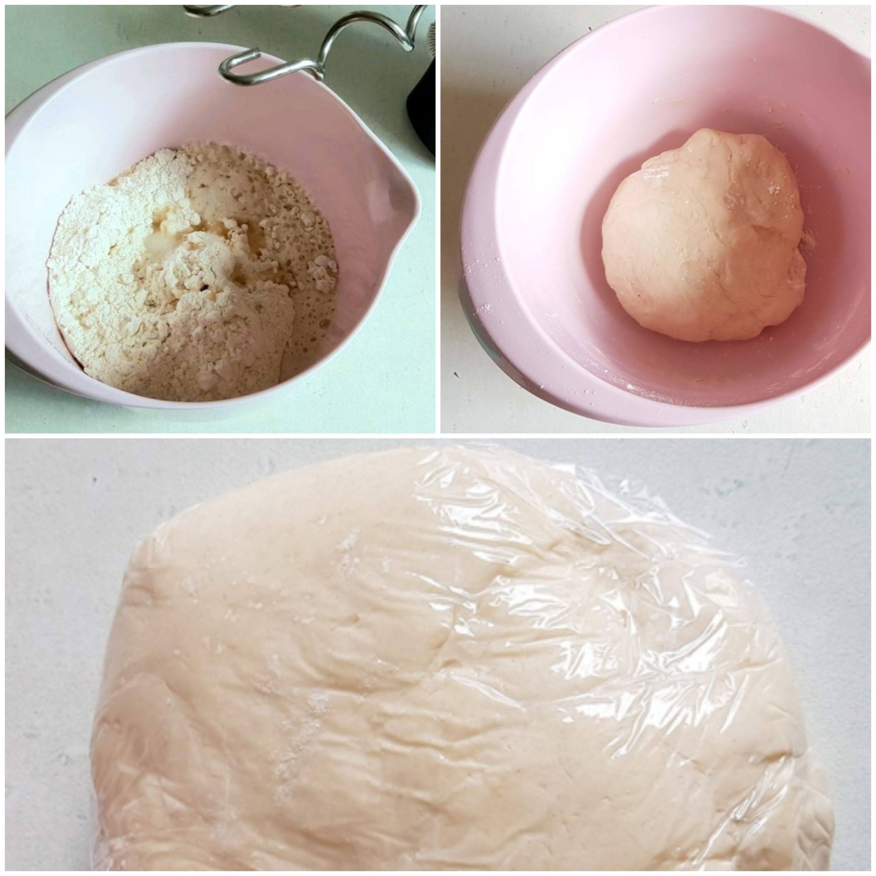 Das Mehl mit den flüssigen Teilen und dem Salz verkneten. Den Teig in Frischhaltefolie wickeln und für 15 Minuten im Kühlschrank ruhen lassen. und bereitest den Belag zu.
