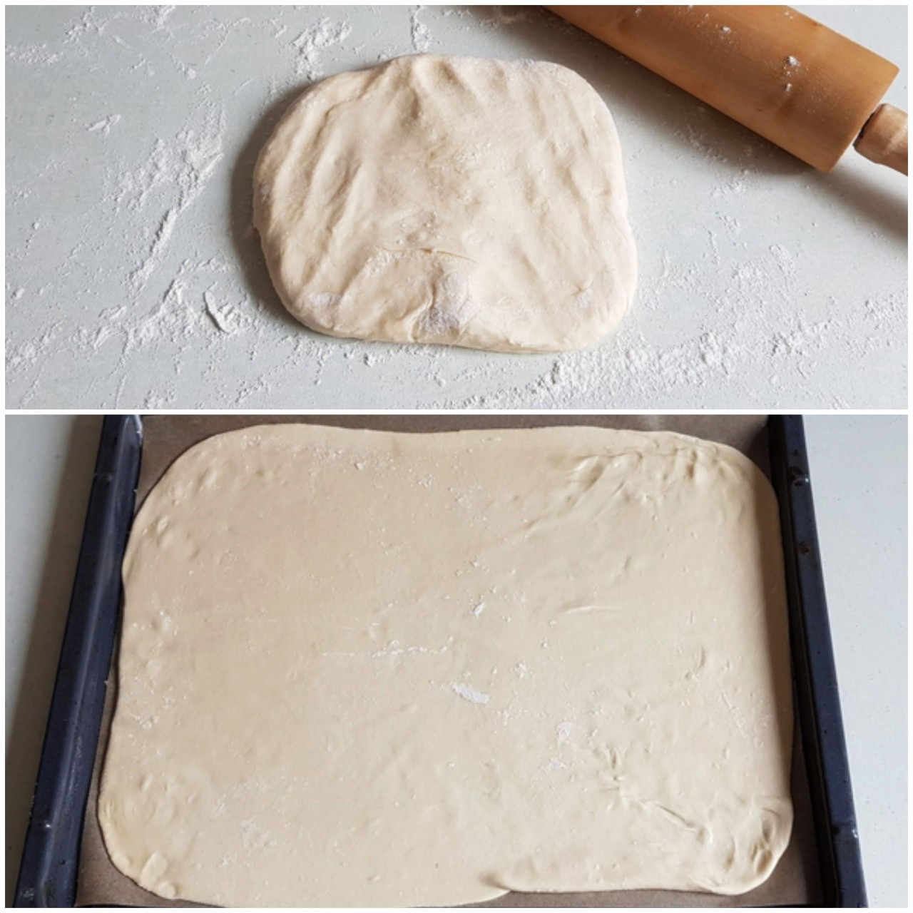 Jetzt ist es Zeit den Ofen auf 220 Grad O/U Hitze vorzuheizen. Rolle den Teig auf etwas Mehl dünn zu einem Rechteck aus und lege ihn auf das mit Backpapier belegte Blech.