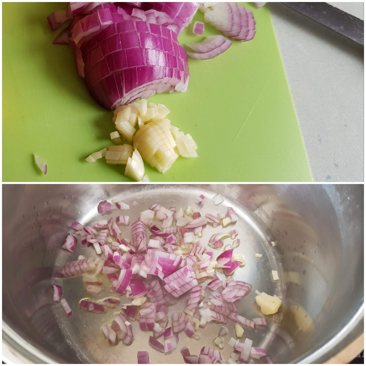 Zunächst die Zwiebel- und Knoblauchwürfel in heißem Öl andünsten.